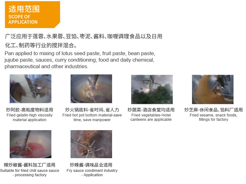 本產(chǎn)品鍋體為一次沖壓成型的半球不銹鋼鍋體,采用電加熱、蒸汽加熱、燃?xì)饧訜?攪拌方式采用特殊的傾斜傳動(dòng),使用的行星攪拌器與鍋體充分接觸,實(shí)現(xiàn)傳動(dòng)公轉(zhuǎn)與自轉(zhuǎn)的不整數(shù)傳動(dòng)比,使鍋內(nèi)無(wú)攪拌死角。使用先進(jìn)的傳動(dòng)與密封結(jié)構(gòu),使傳動(dòng)部分與鍋內(nèi)潔凈、衛(wèi)生。采用變頻調(diào)速動(dòng)力,運(yùn)行更平穩(wěn)。電磁加熱形式打破了明火烹調(diào)方式,具有升溫快、無(wú)明火、無(wú)煙塵、無(wú)有害氣體,對(duì)周圍環(huán)境不產(chǎn)生熱輻射,安全性好和外觀美觀等特點(diǎn),是性能優(yōu)良的食品加工設(shè)備。